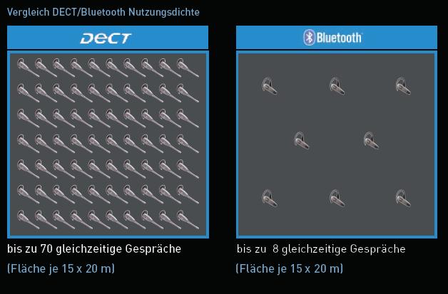 Bluetooth- und DECT-Systeme senden auf unterschiedlichen Frequenzen, sodass es zwischen den beiden Technologien zu keinen Interferenzen kommen kann.